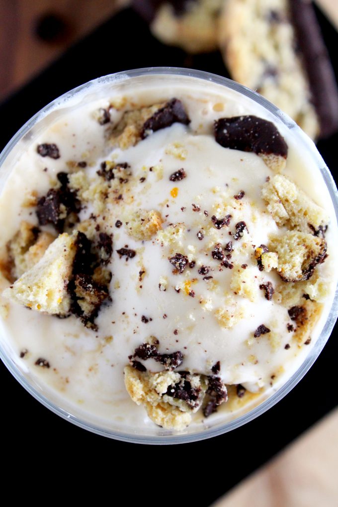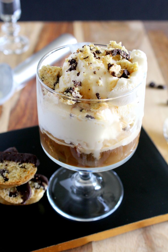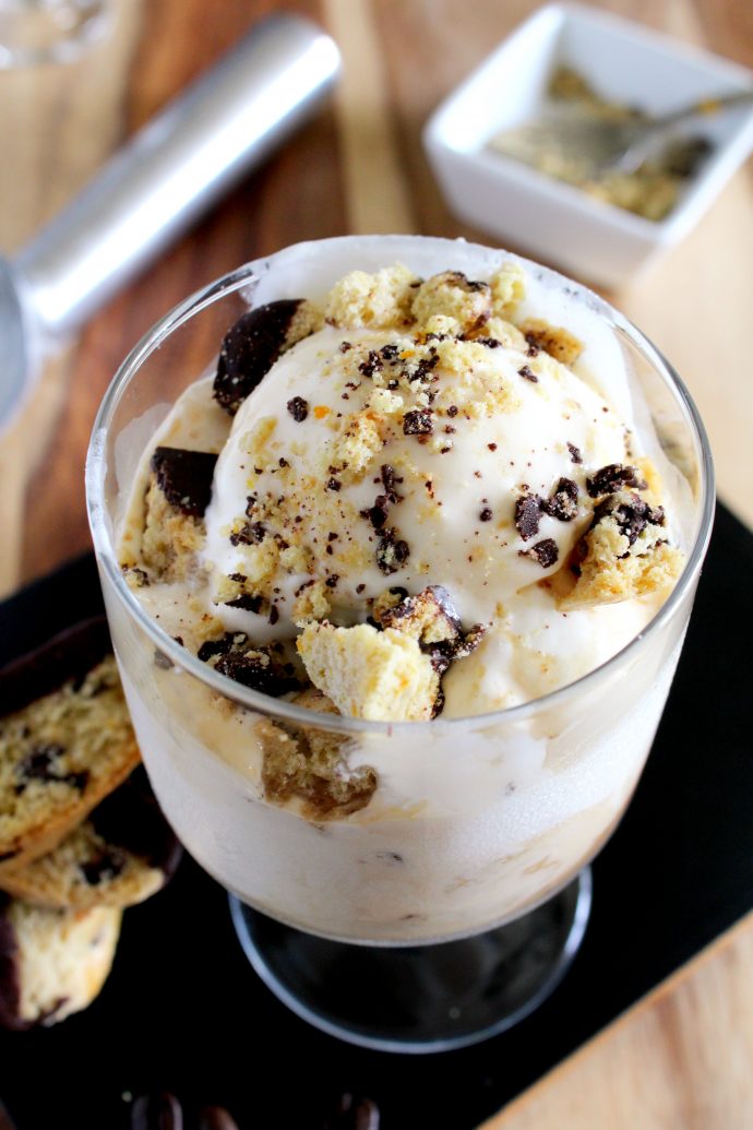 Better yet, prepare this dessert ahead of time by placing 1 scoop of ice-cream in a freezer proof serving glass, sprinkle with crushed biscotti and top with another scoop of ice cream and place in your freezer.