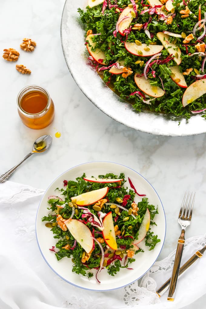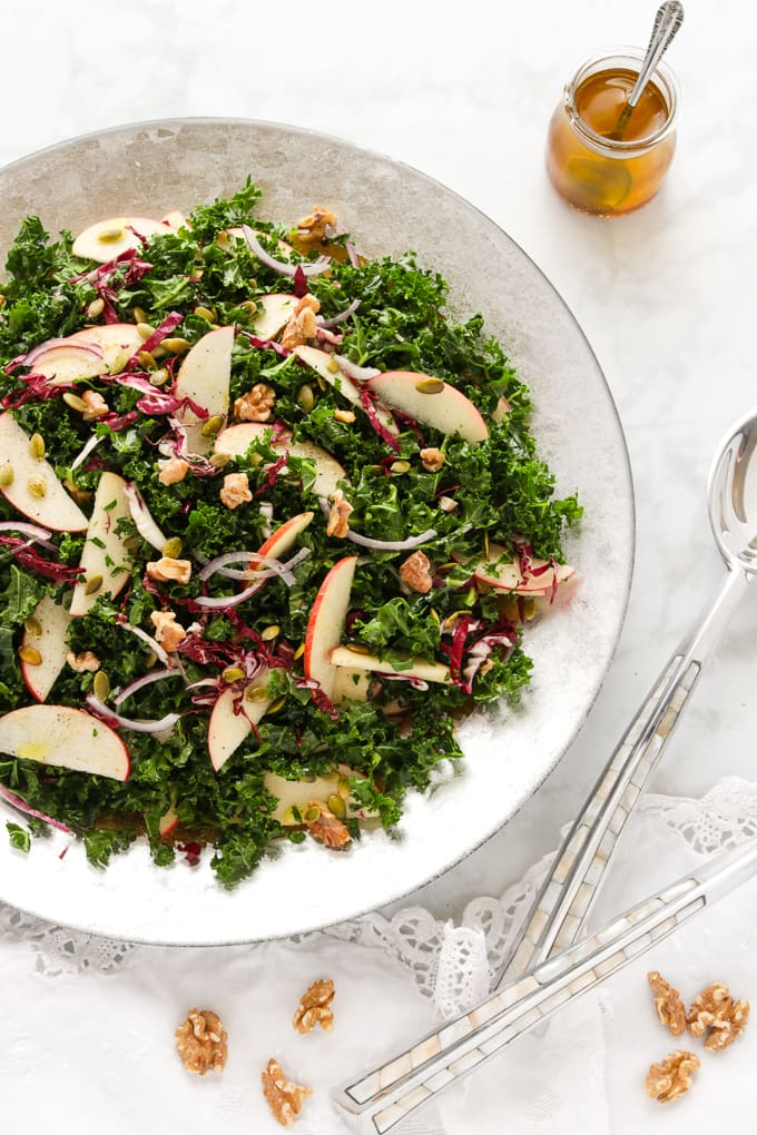 I’m loving the colour contrast in this beautiful salad–dark green kale and red radicchio! Kale is an ideal green to serve at this time of year when lettuce can be lacklustre and expensive! Thanks for a great recipe.