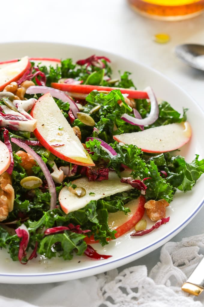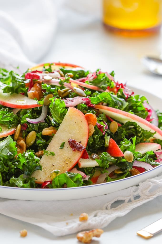 I’ve combined thinly sliced crispy red apples for a little sweetness and some toasted walnuts and pumpkin seeds for a delightful crunch.