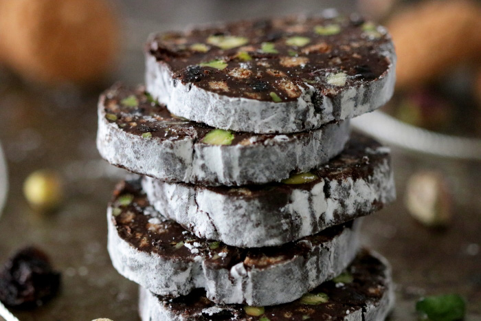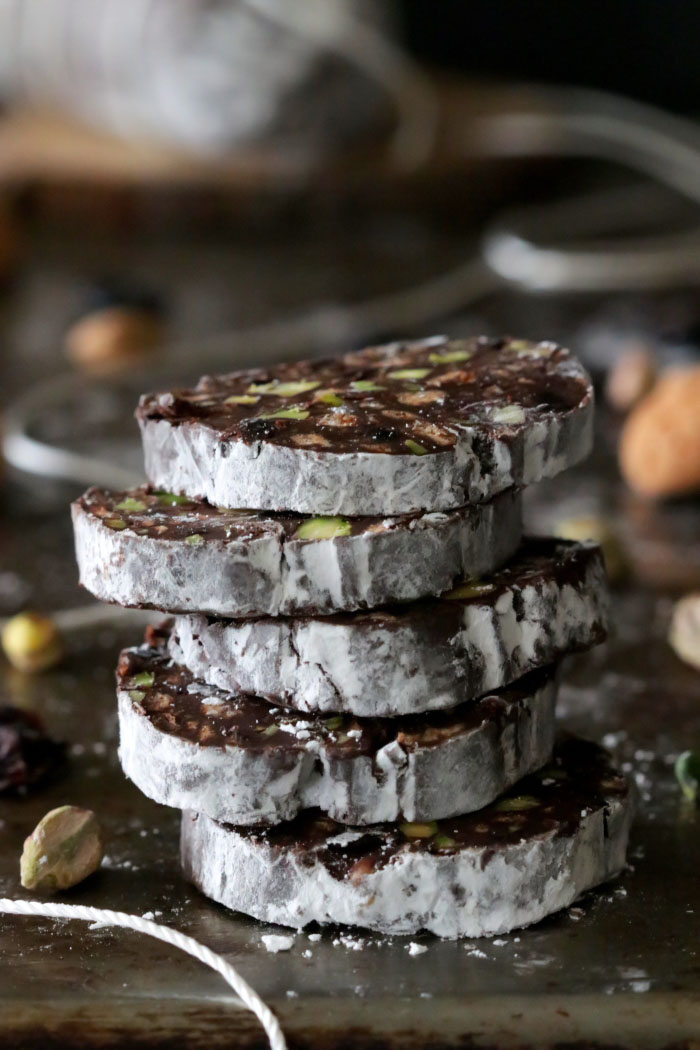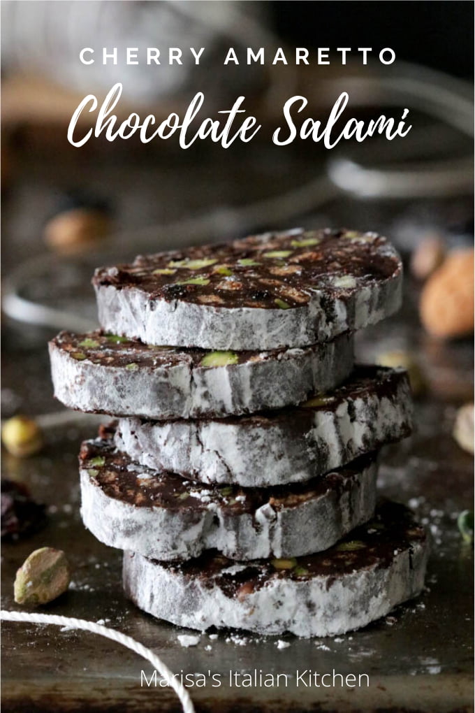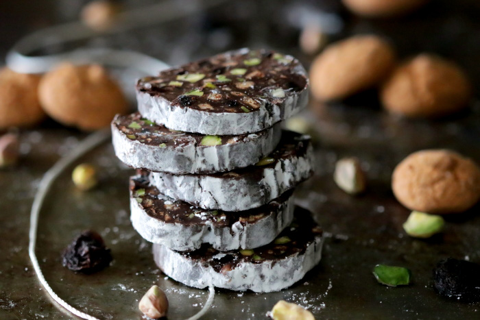 This chocolate salami is made with 70% dark chocolate. It’s also studded with pistachios, crushed amaretti cookies and some plump amaretto soaked cherries. There is so much to love about this special dessert!