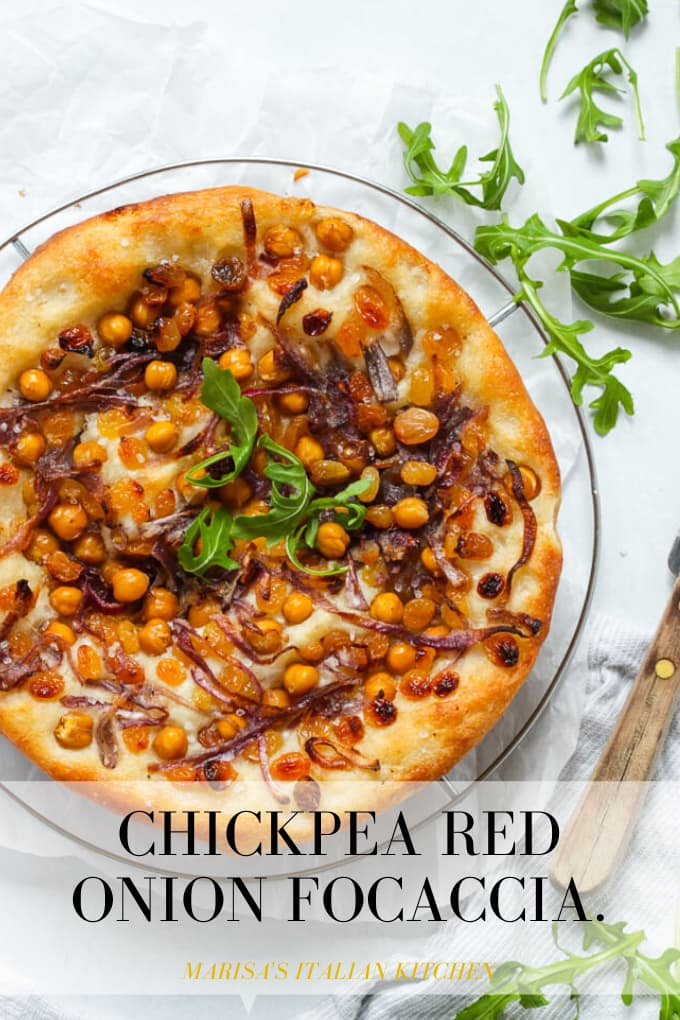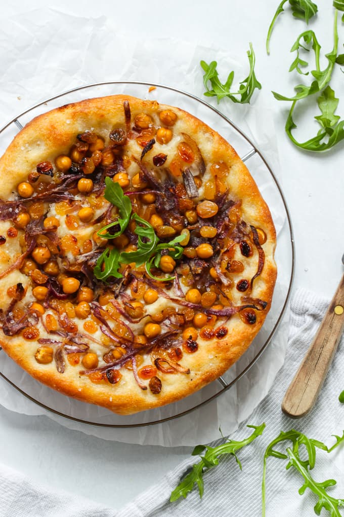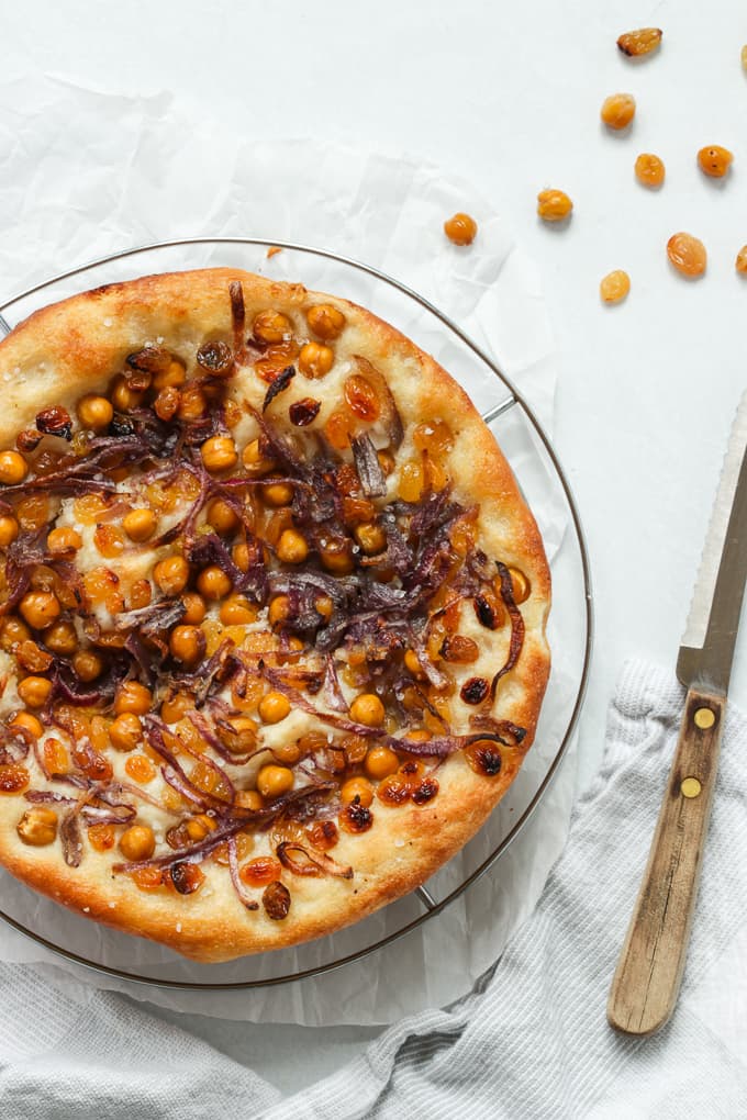 I never get enough of raisins in savoury dishes. Surprisingly chickpeas work really well over focaccia and it’s such a lovely contrast to the soft and fluffy dough! We love it!