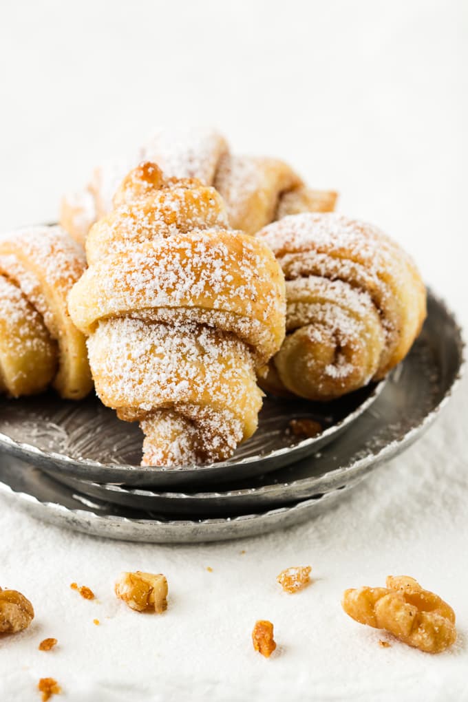 These buttery and flaky Cinnamon Walnut Croissant Cookies are made with a sour cream based dough and greatly resemble mini pastries. They’re little morsels filled with a sugar, cinnamon and nut mixture and never fail to please. A dusting of powdered sugar is all that’s needed to dress up these mini croissant cookies.