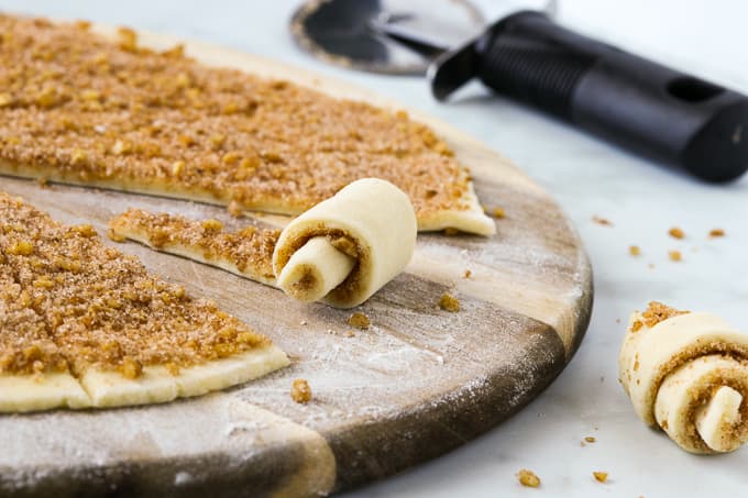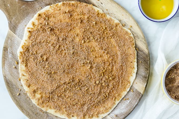 - Top with a sprinkle of cinnamon and nut mixture over the buttered dough. (for each disc of rolled out dough, I sprinkle about 4 generous tablespoons of cinnamon nut mixture)
