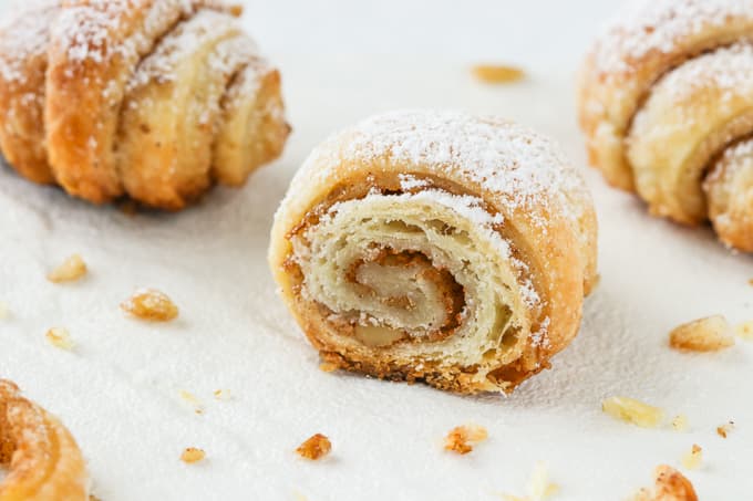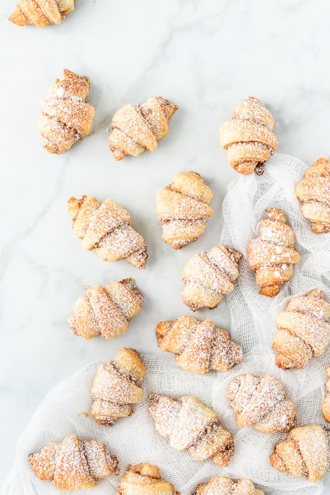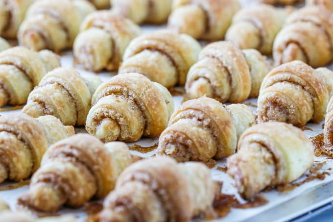 My mother-in-law’s croissant cookies were the prettiest cookies ever! Tiny twirls of goodness both flaky and crisp, packed with a sugar nut mixture and the unmistakable scent of cinnamon!