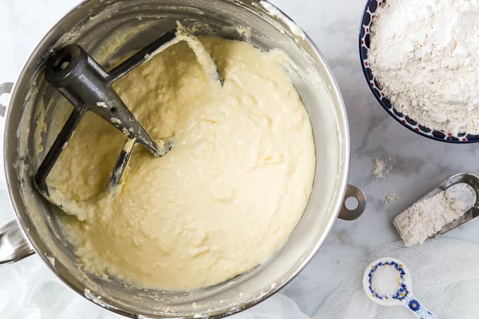 - Switch to "stir mode" on the stand mixer and stir in the flour and the salt until the flour is thoroughly combined. (If not using a stand mixer, stir with a wooden spoon)
