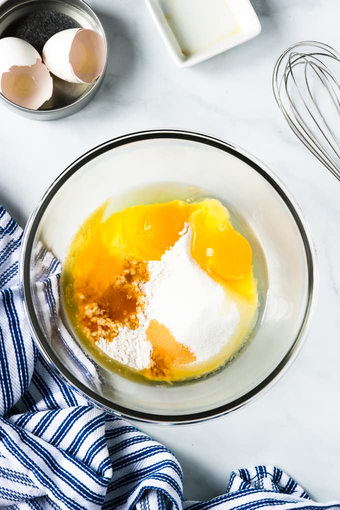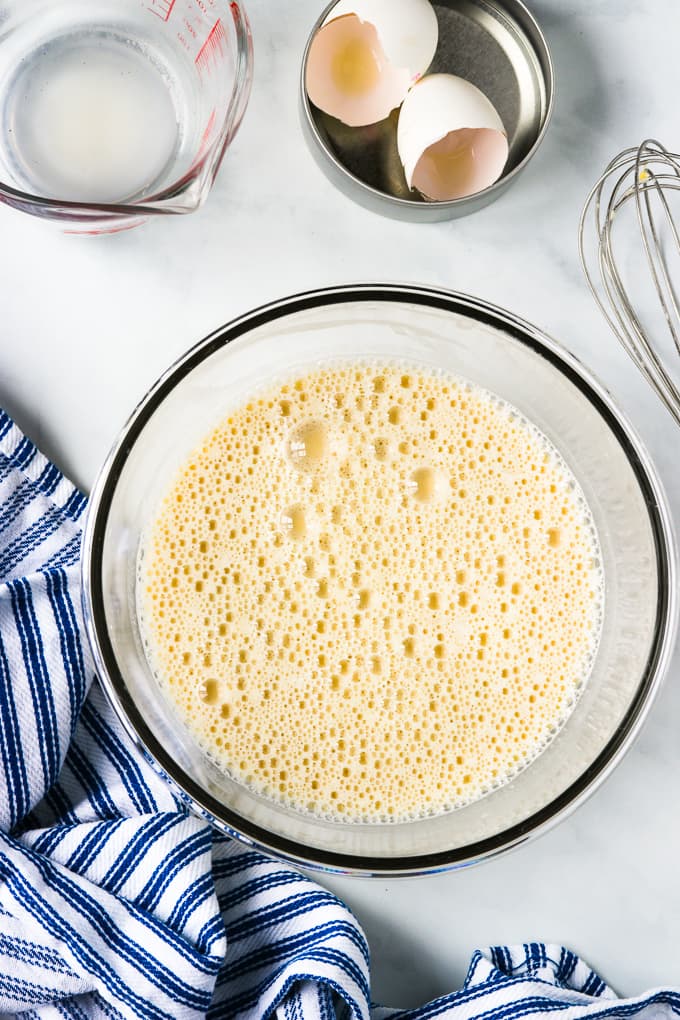 - In a medium sized bowl, combine the flour, eggs, sugar, vanilla extract, salt, milk and whisk all ingredients together.