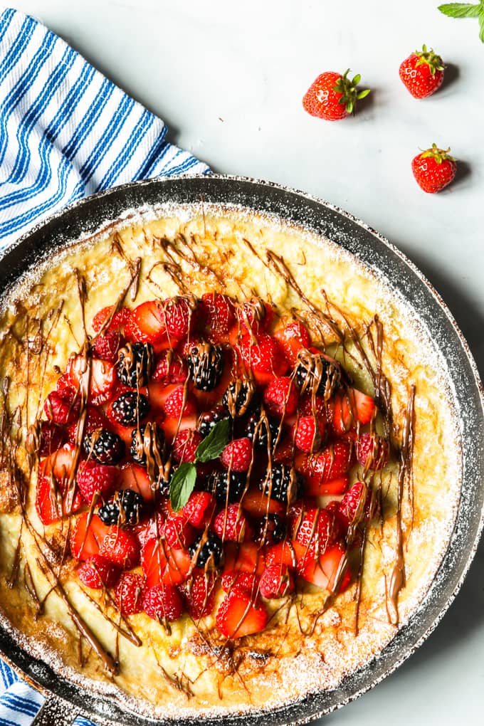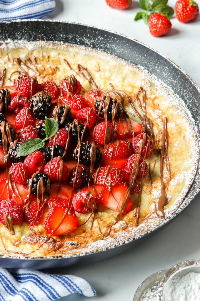 This Crespella with Nutella recipe is an Italian oven baked pancake filled with fresh strawberries, raspberries and blackberries. It makes a perfect weekend indulgent breakfast or even brunch!