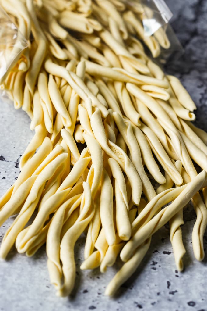 This type of pasta shape is formed by pressing and rolling thin rods, in a back and forth motion, over strips of dough.