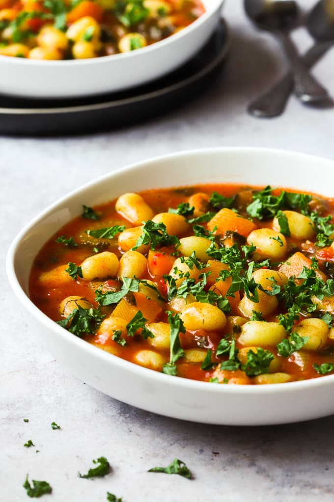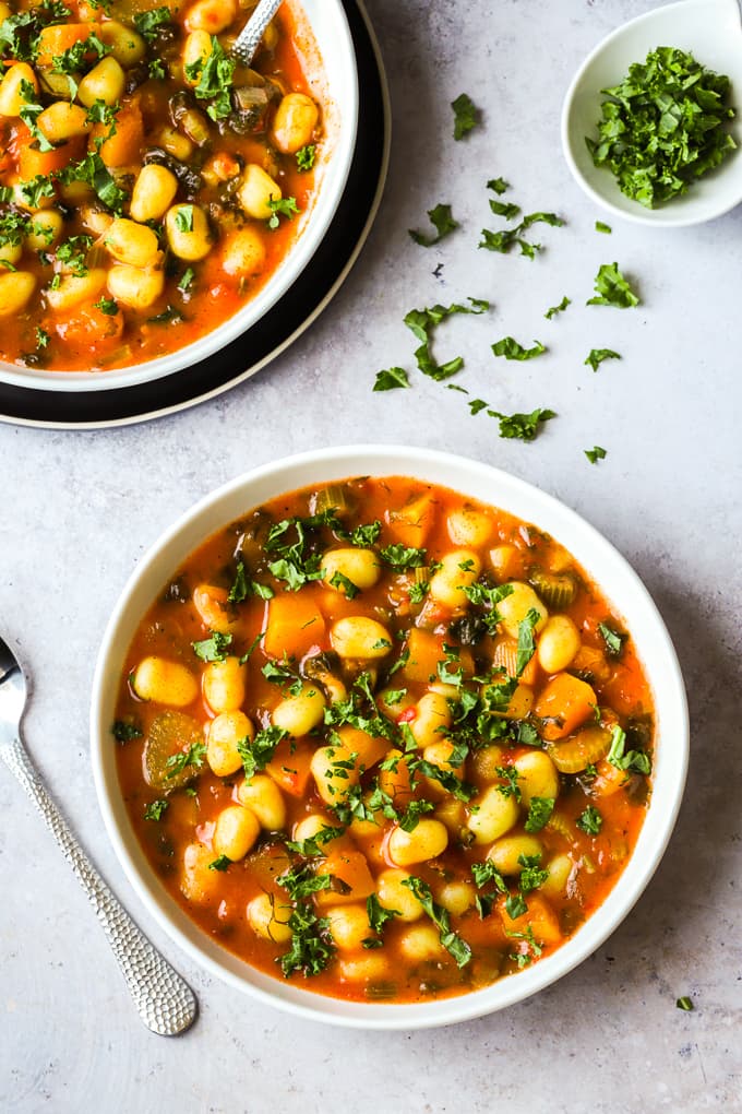 Store bought, pre-packaged potato gnocchi are far firmer than the homemade fresh gnocchi and hold up well in a soup without getting mushy or soggy. That’s the reason I always use the ones sold at my local supermarket when making this vegetarian gnocchi soup recipe.