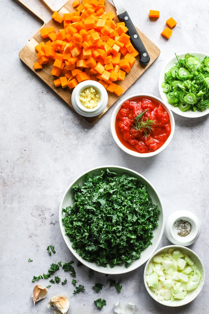 This Gnocchi Soup with Butternut Squash and Kale is one big warm hug in a bowl. It’s a meatless soup chock full of cubed butternut squash, kale, tinned tomatoes, fennel, and mini potato gnocchi.