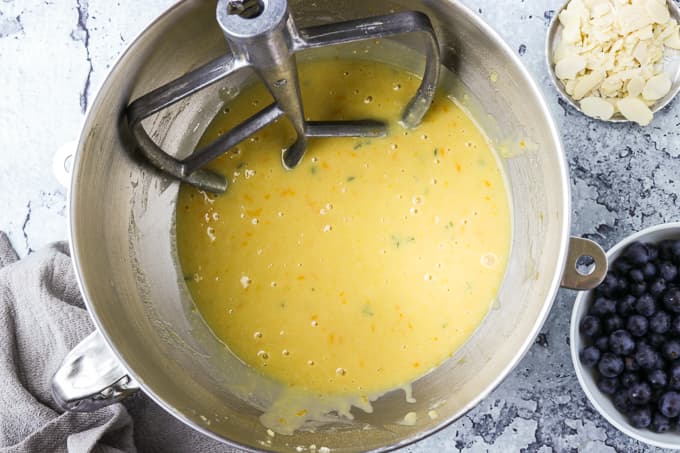 - Add the olive oil, milk, vanilla and almond extracts, zest and thyme to the egg mixture. Mix until well incorporated.