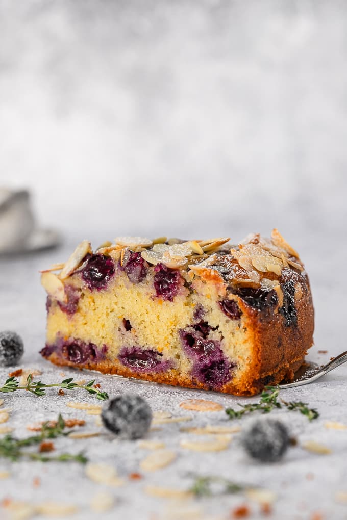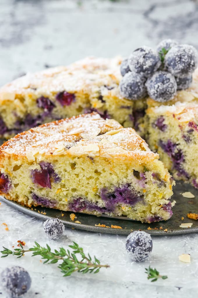 It stays incredibly moist for days and has a lovely contrast in texture with some crunchy sliced almonds scattered over the grape cake.