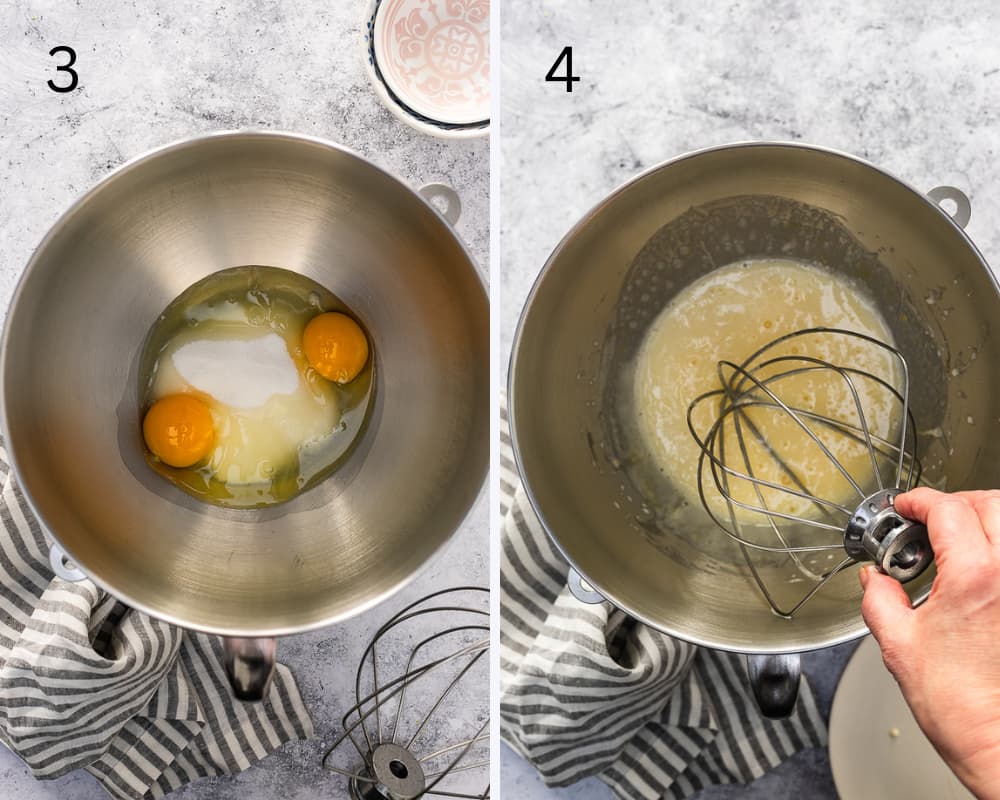 - Place the eggs and sugar in the bowl of a stand mixer. (Or use a large bowl with a handheld mixer)