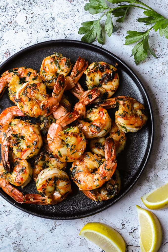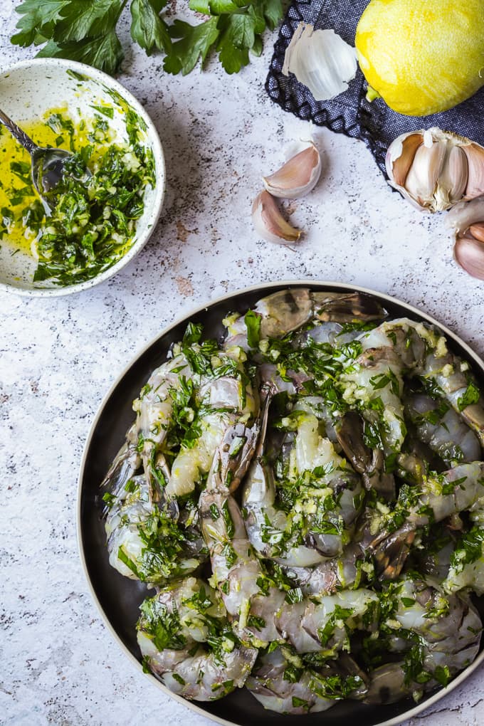 - In a bowl toss together the shrimp, extra virgin olive oil, lemon zest, chopped parsley and minced garlic.