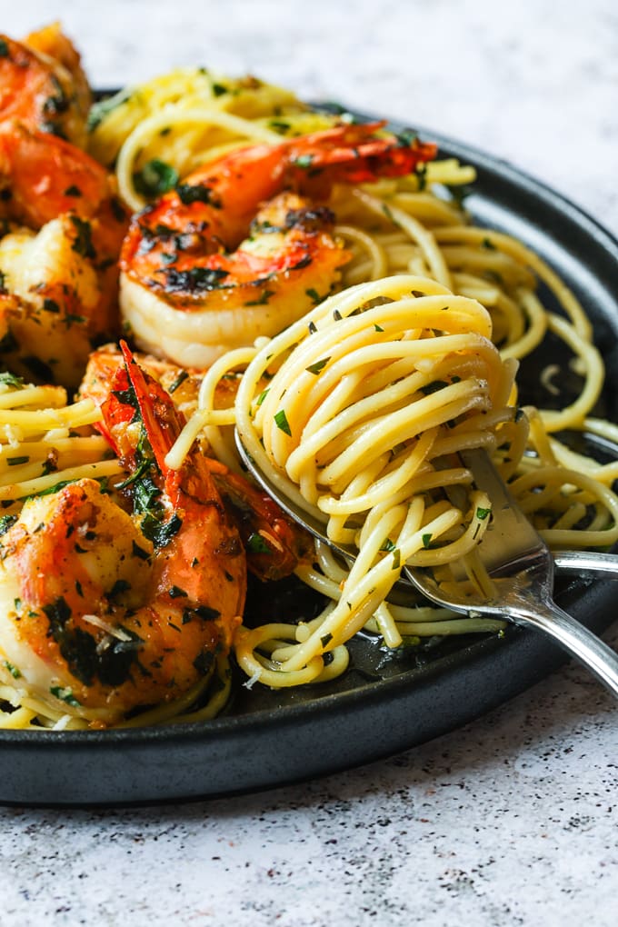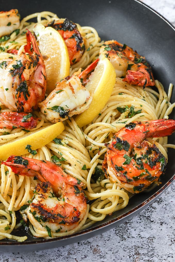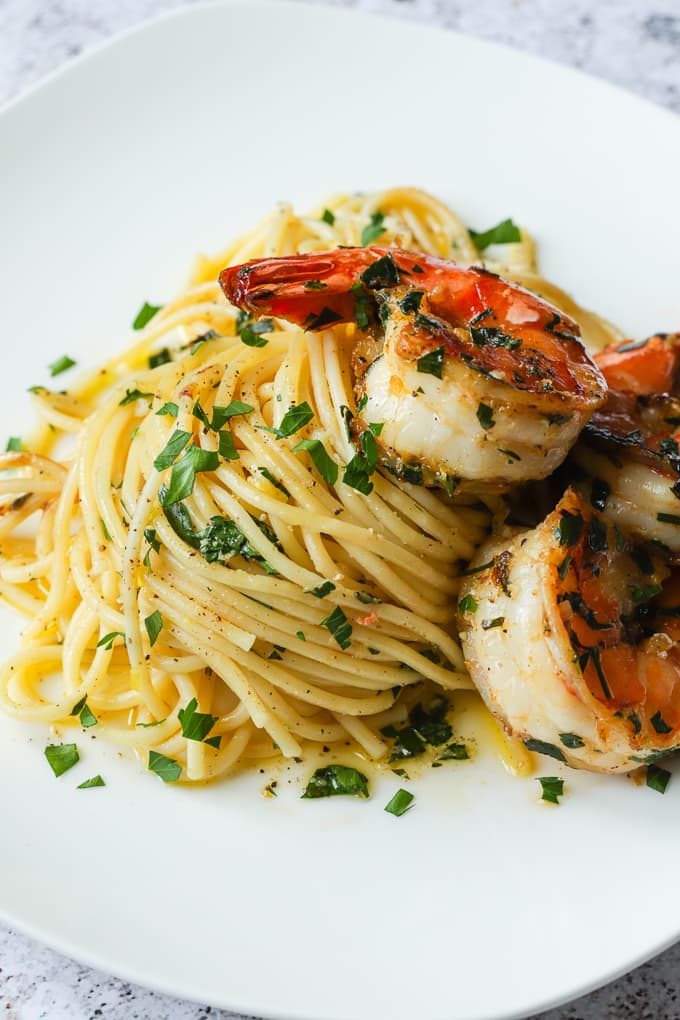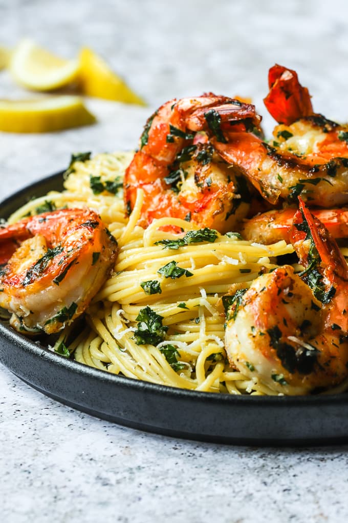 You can transfer the lemon spaghetti onto a serving platter and top the pasta with the pan seared shrimp, a sprinkle of chopped fresh parsley and a little drizzle of extra virgin olive oil. And let your family help themselves!