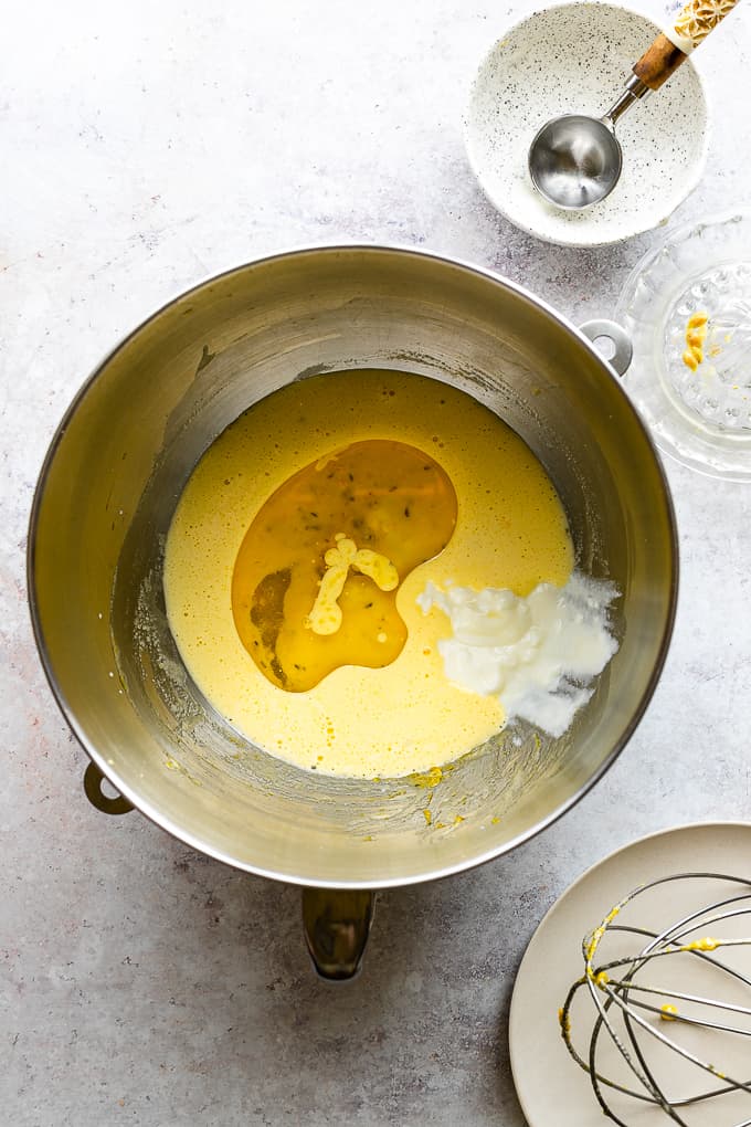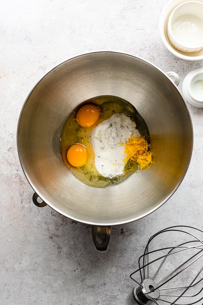 - In the bowl of a stand mixer, with the whisk attachment, whisk together the sugar-thyme mixture, eggs, olive oil and lemon zest. (For about 2 minutes)