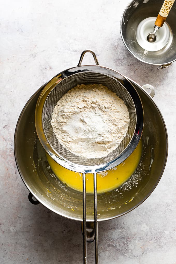 - Flour: The flour along with the baking powder and salt is sifted directly over the wet ingredients to break up any lumps while making mixing that much easier.