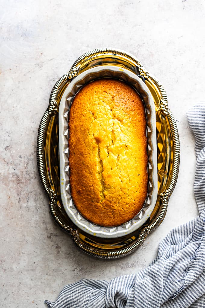 - Allow the cake to cool slightly in the loaf pan for about 10 minutes.