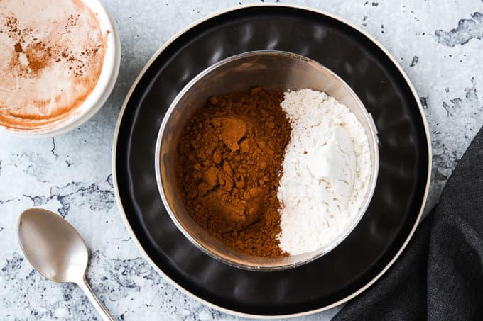 - Place the flour and cocoa powder in a small mixing bowl.