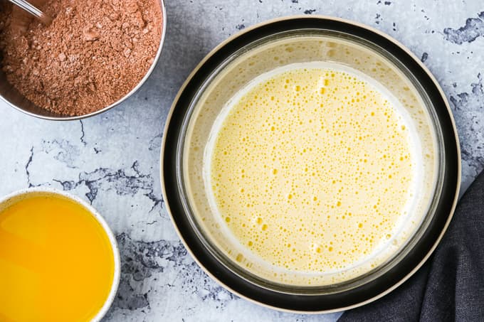 - Beat with an electric mixer on medium speed until thick and pale yellow in colour, about 2 minutes.