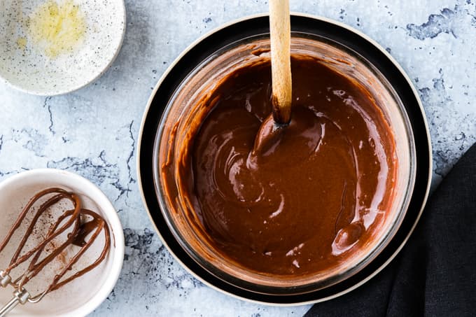 - On low heat, stir until the butter is melted and the chocolate mixture is smooth.