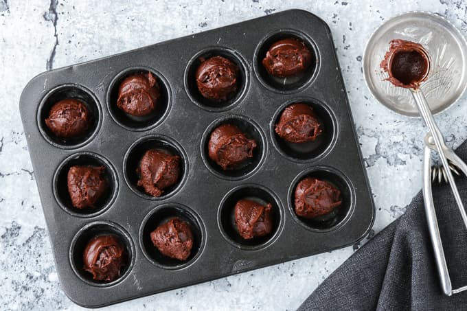- Divide the batter evenly among the prepared mini muffin tins. I used a 1 and a half inch cookie scoop but you can just as easily use teaspoons to measure out the batter.