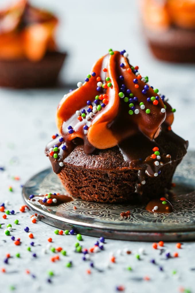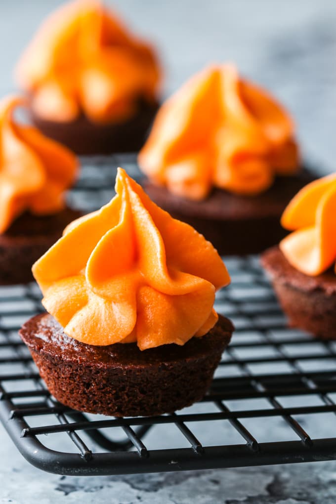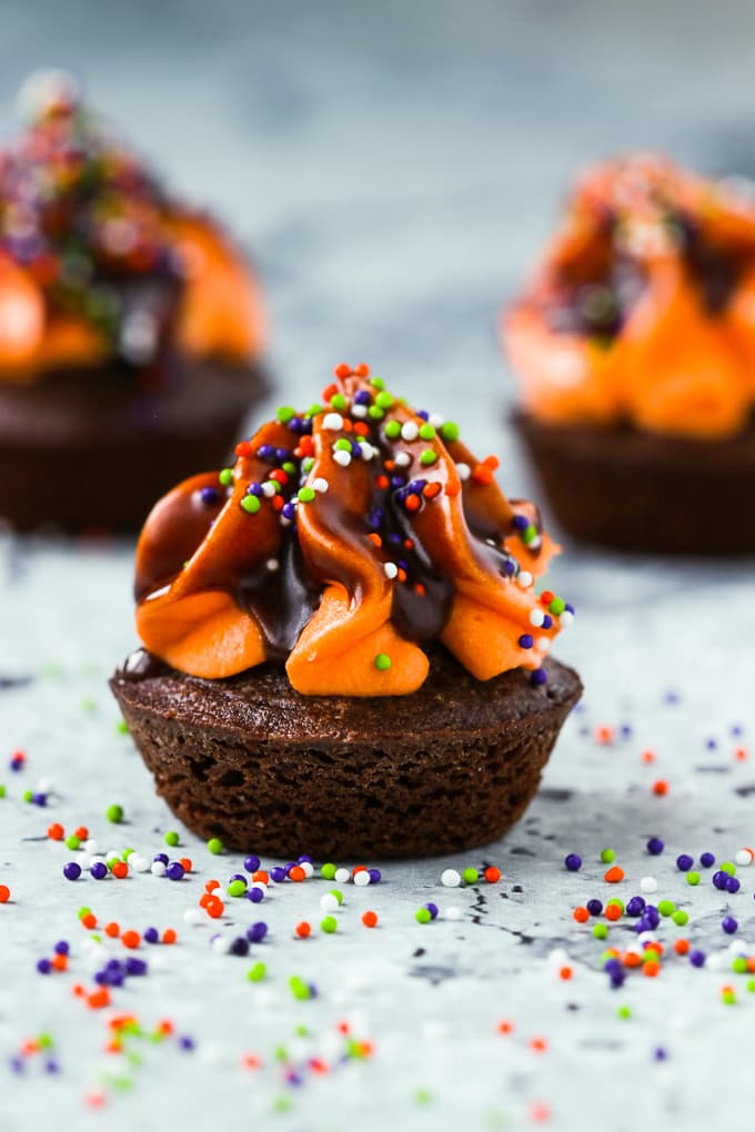These Mini Brownie Bites with Cream Cheese Frosting are a two bite marvel and an absolute delicious treat for Halloween. The swirl of orange tinted cream cheese frosting is dipped in a chocolate glaze and topped with sprinkles.