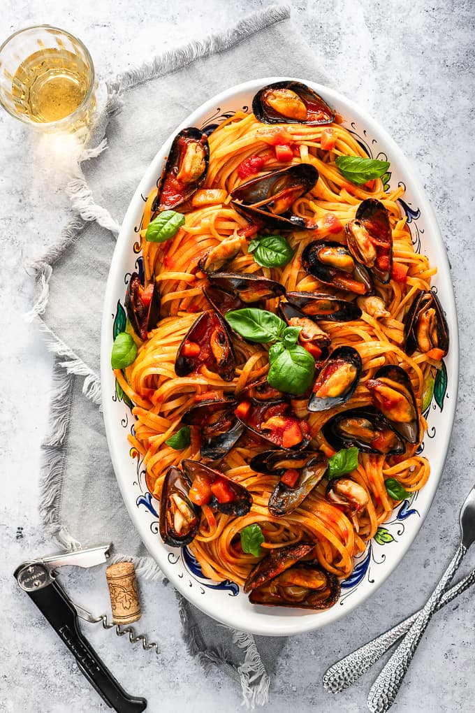 You can either drain the pasta, toss it with the tomato sauce, and top with the mussels in a large serving bowl, garnished with a sprinkle of basil leaves, or plate individual servings.