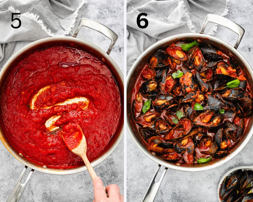 6- Add the cleaned mussels directly into the pan with the tomato sauce and simmer for approximately 8 minutes. As the mussels heat up, they will begin to open, releasing their natural juices into the pan and gently loosening the sauce.