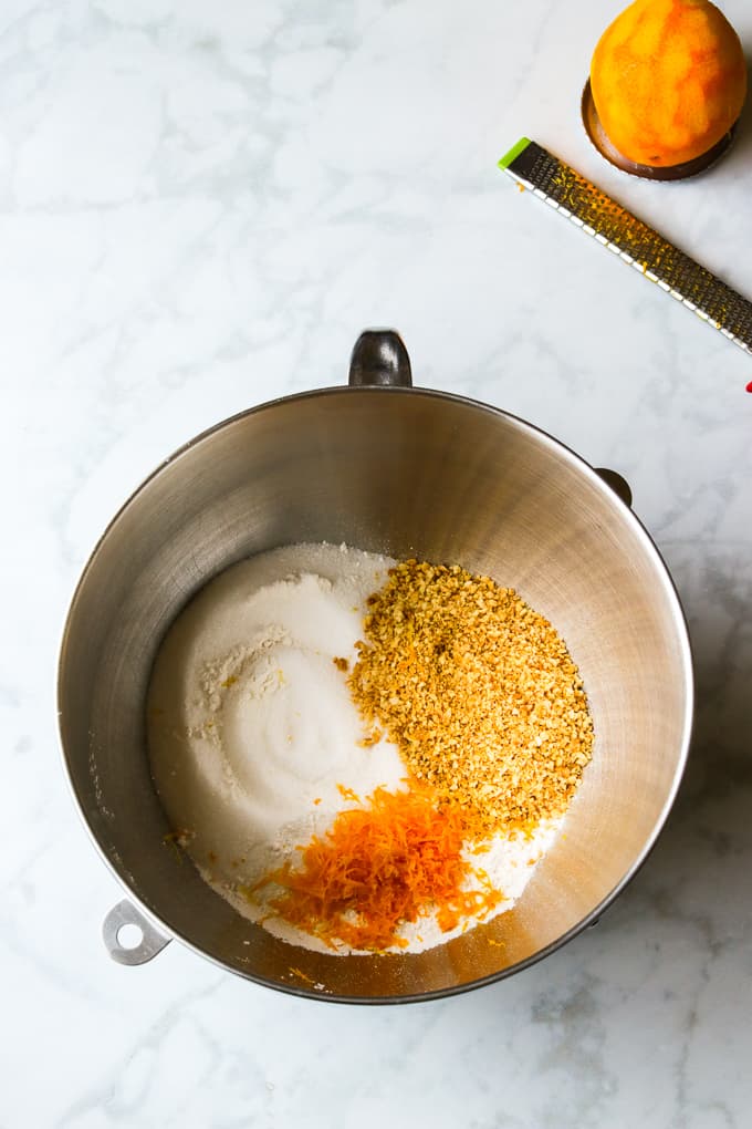 - Place the flour, finely ground hazelnuts, sugar, baking powder, salt and orange zest in the bowl of a stand mixer.