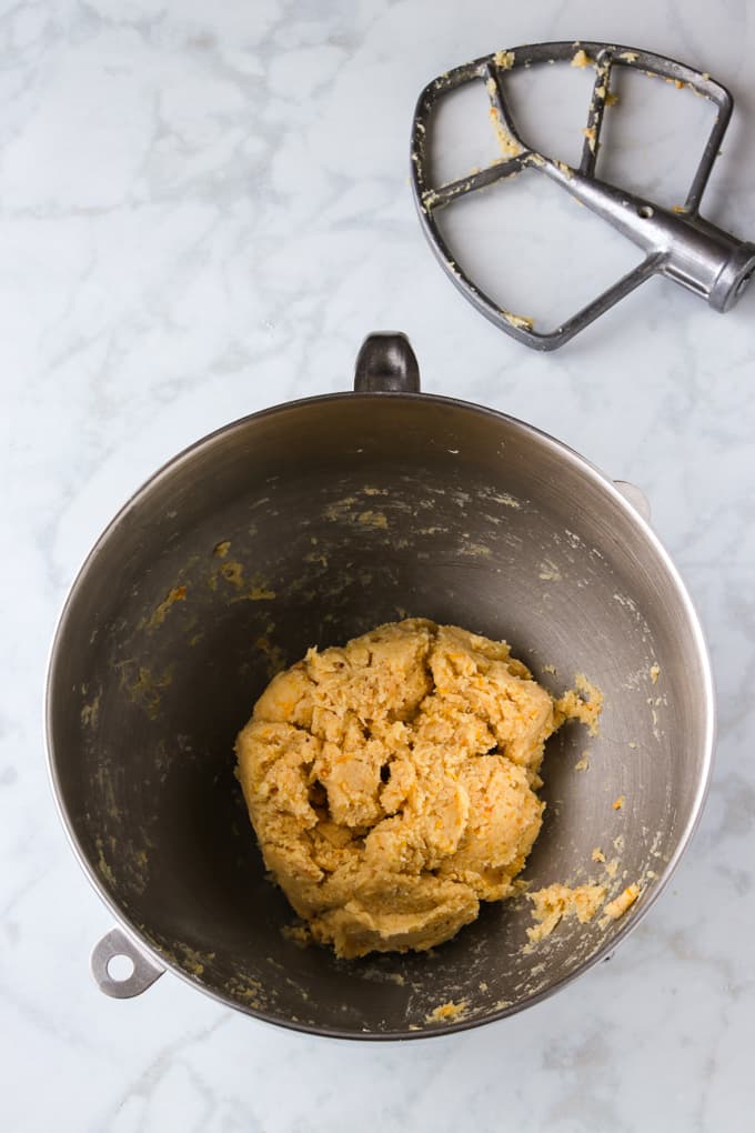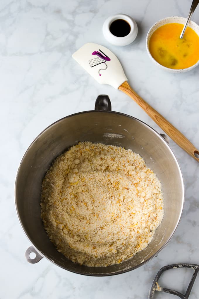 - With the paddle attachment, mix on medium low speed until you achieve a coarse sandy consistency. If there’s a few larger pieces that’s ok.