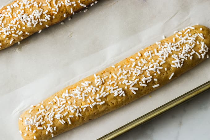 - Sprinkle the tops of the biscotti logs with the sugar granules.