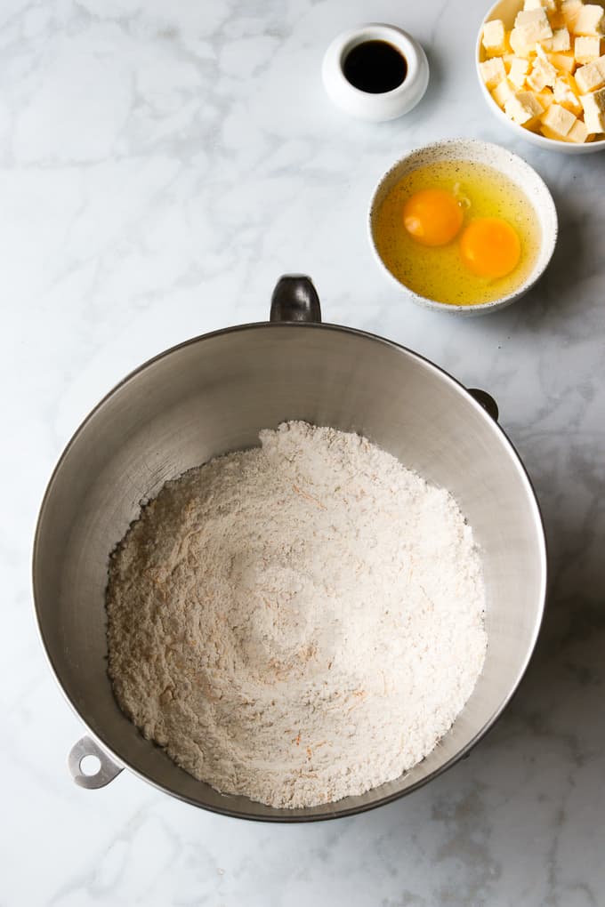 - Place the flour, hazelnuts, sugar, baking powder, salt and orange zest directly in the bowl of a stand mixer and stir to combine.