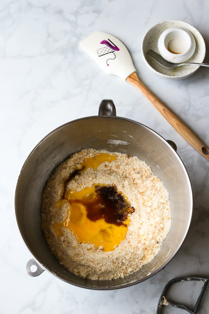 - Mix in the beaten eggs and extracts until well combined and you have a soft workable dough.