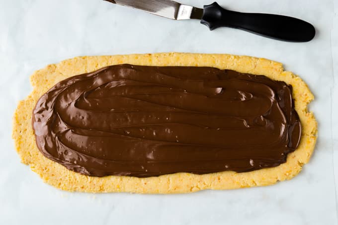 You’ll find the Nutella’s unique creaminess makes it a perfect spreadable concoction over this rolled out biscotti dough.