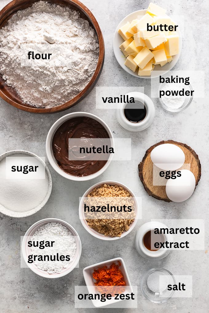 To make these Nutella biscotti, you’ll need just a few simple pantry staples that you probably already have on hand.