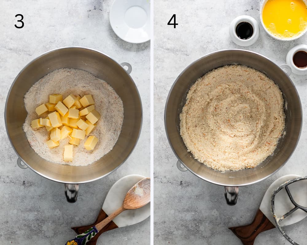 4 – With the paddle attachment, mix on medium-low speed until you achieve a coarse sandy consistency. If there are a few larger pieces, that’s ok.