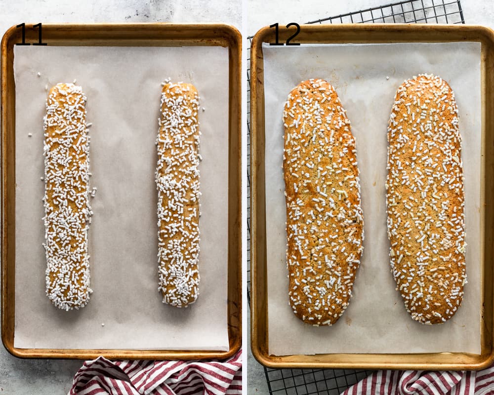 11 – Brush the biscotti logs with the beaten egg white and sprinkle the tops and sides with sugar granules. You can substitute the decorative sugar granules with sanding sugar or turbinado sugar.