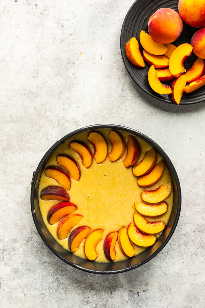 Place the peach slices side by side in a circular fashion, along the outer edges of the cake pan. Repeat with a second row while fanning them out as much as you can, in keeping with a circular pattern.