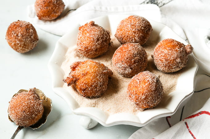 If needed you can always re-roll the zeppole in the cinnamon sugar when serving the following day. This will refresh their appearance.