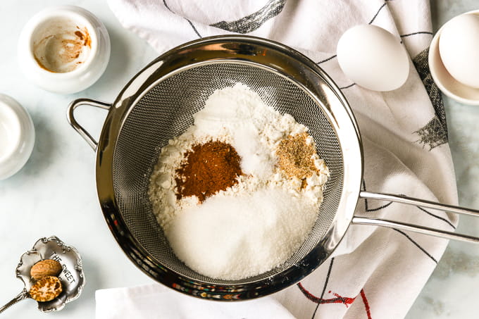 - Sift together the flour, sugar, baking powder, cinnamon, nutmeg and salt.