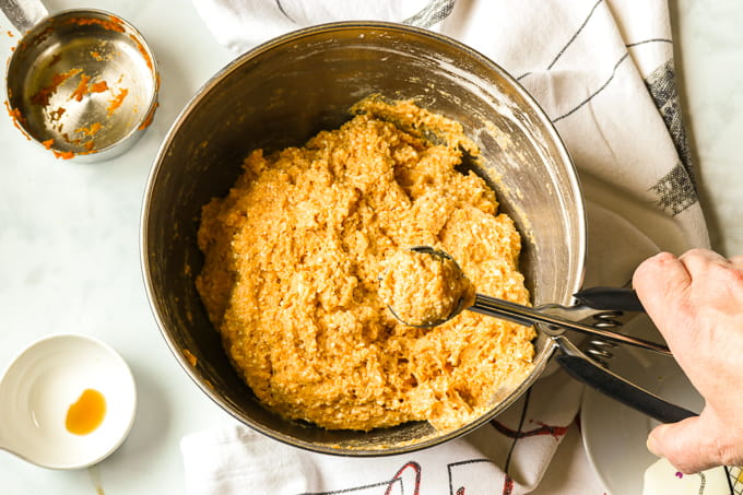 A cookie scoop comes in handy to measure out and drop bits of the pumpkin ricotta batter into the hot oil.