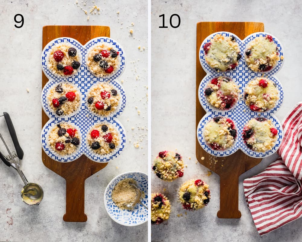 - Sprinkle the crumb top mixture evenly over each muffin and top with a couple more berries.
