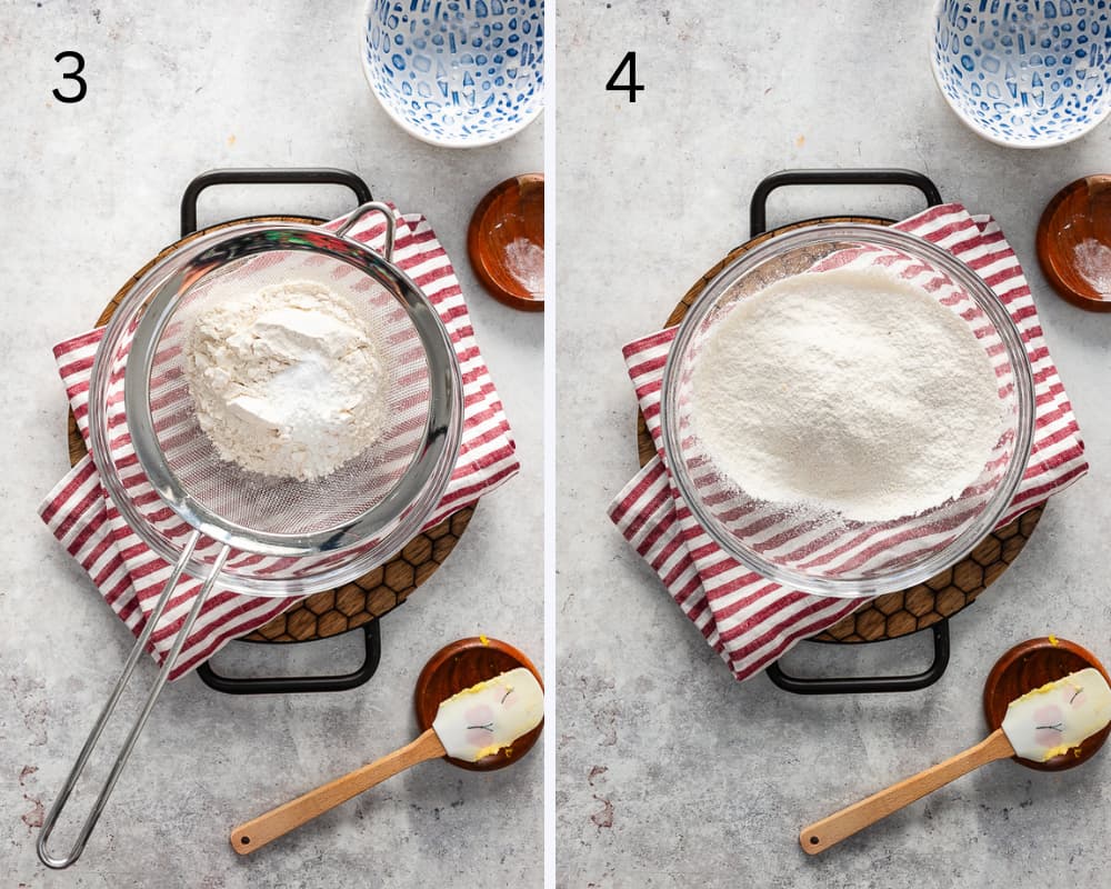 - Sift the flour, baking powder and baking soda into a bowl. Set aside.