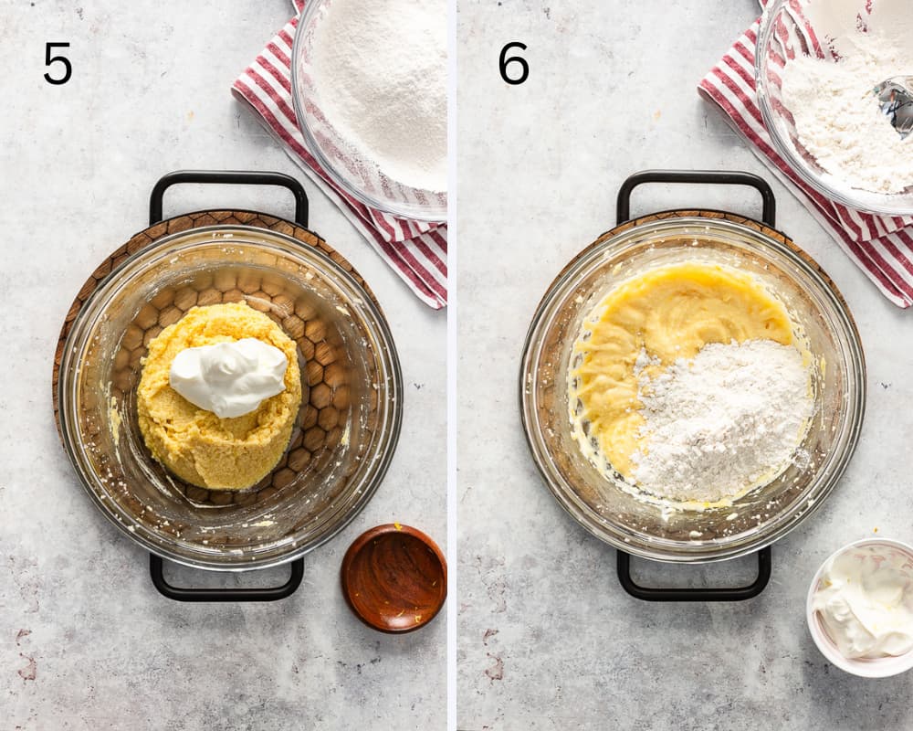 - Repeat by mixing in the remaining sour cream, then the flour mixture. Do not overmix.