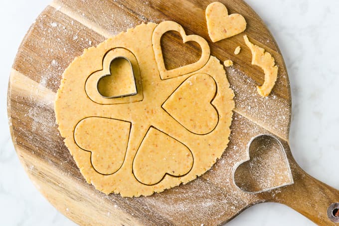 They’re made with finely ground roasted hazelnuts which really compliment the raspberry jam. But you can also make them with almonds. Just remember to grind them really fine so that you have no problem pressing the cookie cutter through the dough.