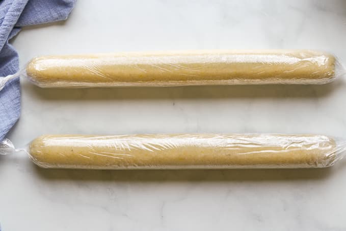 Divide the dough into 2 equal portions and roll out into logs of about 1 1/2 inch in diameter.