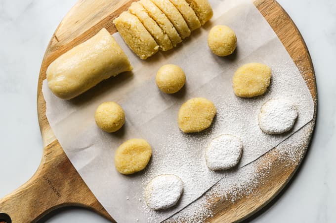 When you’re ready to roll the dough, dust both your hands and work surface with a little powdered sugar.