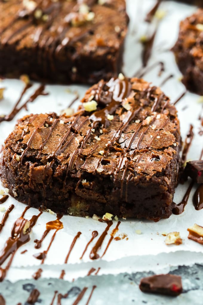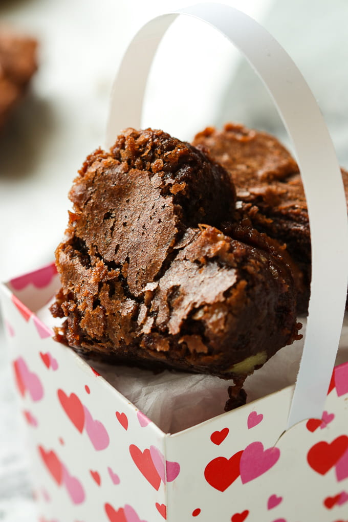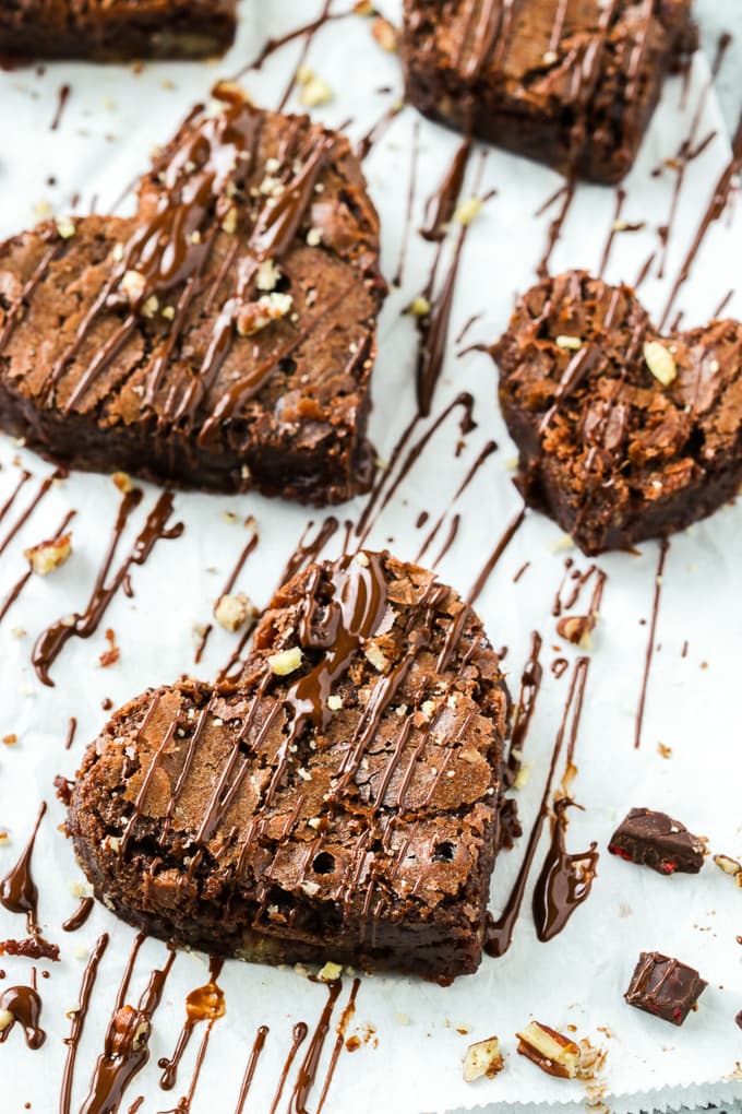 - Slice the brownies into squares or use a 2 or 3 inch heart shaped cookie cutter to form the hearts. (you can also do a combo of small and bigger hearts)