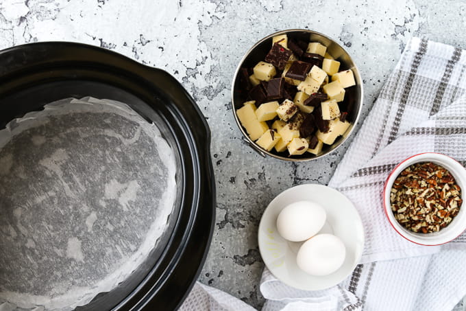 Grease the inside with butter or margarine and line the bottom with parchment paper while over extending along the sides of the slow cooker. This facilitates the removal of the brownies.